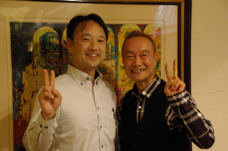 CDジャケット用撮影をルッコラで行いました。マスターもその気になってポーズ。う〜ん、足の長さ・・・見せられない!